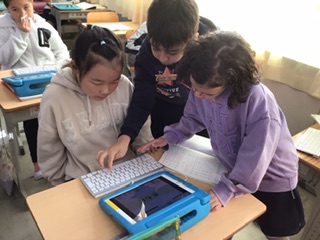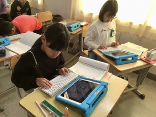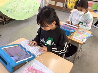 キーボードを使って、ローマ字入力で言葉や文章を打ち込んでいます。小さい「っ」や伸ばす音をどう書き込むのか、確認しながら進めています。