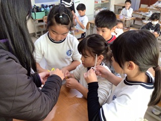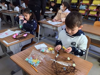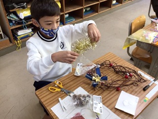 収穫したお芋のつるを使って、クリスマスリース作りをしています。家から持ってきたモールや針金で、綺麗に飾り付けをしています。