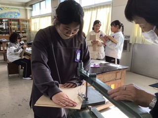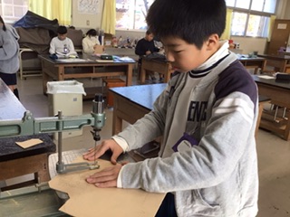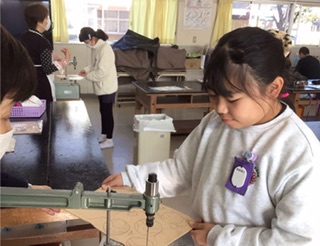 図工の時間です。電動糸のこぎりを使って、板を切って伝言板を作ります。安全のために、先生と一緒に慎重にのこぎりを動かしています。みんな上手に切れています。