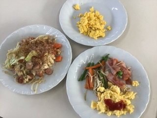 4日に2組、5日に1組が調理実習を行いました。野菜のベーコン巻き、豆腐と野菜のチャンプルー、ベーコンポテトから一品とスクランブルエッグを作りました。どの班の料理も美味しそうです。