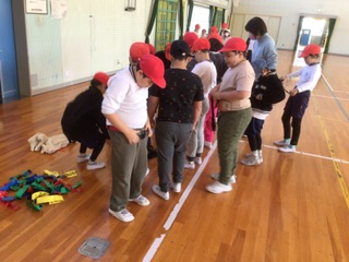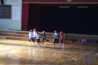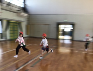 今日の体育はタグラグビー鬼ごっこです。腰につけたタグを取ろうと追いかける子、守るために素早く逃げる子、みんな元気いっぱいです。