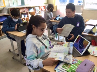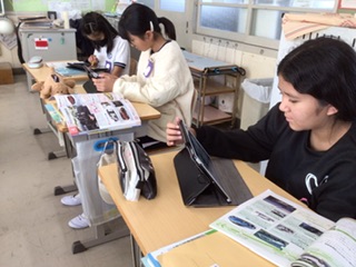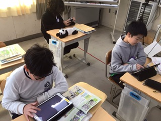 1組と同様、2組でも学習用タブレットを使って、「自動車づくりのすごいところ」としてまとめを作成しています。みんな集中して、黙々と取り組んでいます。音声付きのまとめをしている子は、少人数教室で作業しています。