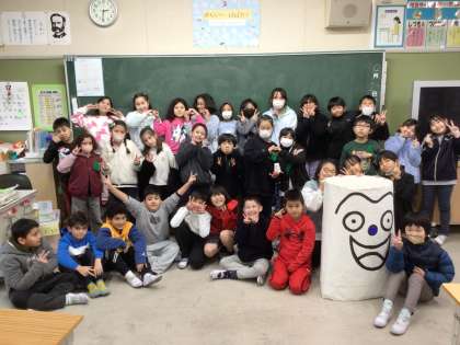 2年生の2クラスが今年度から1クラスになり、仲の良い友達ができました。鳥やキモッチがクラスの仲間になって楽しいクラスになりました。総合的な学習の時間では、仲良しのキモッチを助けるために健康に良い献立を考えました。これからも仲間を大切に学校生活を送っていきたいです。