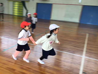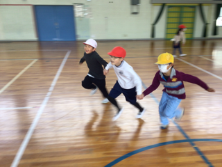 今日は冬らしい寒さの日ですが、体育をしている1年生は元気いっぱいに身体を動かしています。体育館中を駆けまわって、手つなぎ鬼を楽しんでいました。