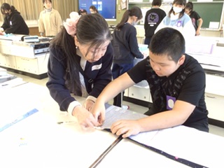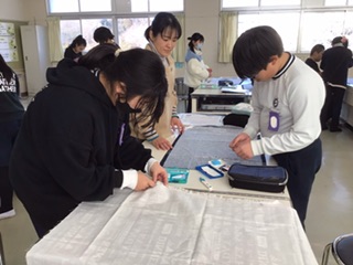 5年生は、家庭科でエプロン作りに取り組んでいます。今日はわきと胸の部分を三つ折りにして、しつけをしていきます。ミシンボランティアの方の助けを受けながら、とても慎重に進めています。