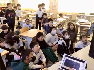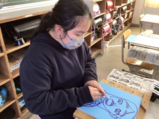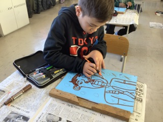 いよいよ今日から彫刻刀で彫り始めます。まずは映像を見て、彫刻刀の安全な使い方について学びました。版画なので、黒くしたい部分を残して彫っていきます。板を回しながら作業することに慣れていないので、そこも大変です。