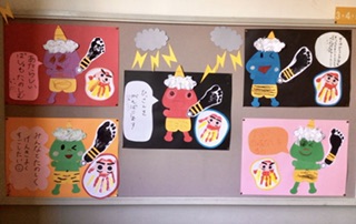 自分の手形と足形を使った掲示物が完成しました。中校舎の階段踊り場に貼ってあります。鬼もとてもかわいいです。