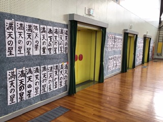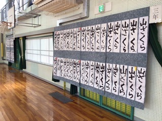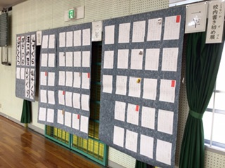 体育館後方に子どもたちの力作が並んでいます。学習発表会が行われる8日(土)まで展示してありますので、ぜひご覧ください。