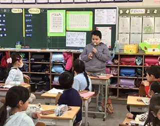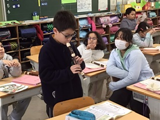 リコーダーで「パフ」という曲を、一人ひとりで演奏しています。演奏している人も、聞いている人も、どちらも真剣な表情です。奏で終わった人には、あたたかい拍手が送られていました。