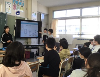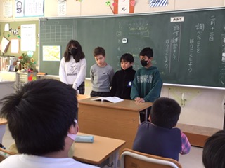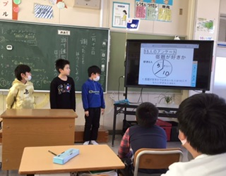 国語の授業です。自分たちで決めたテーマについて、アンケート等をして調べたことを発表しました。趣味について、宿題について、食べ物についてなど、テーマはいろいろです。棒グラフや円グラフを使ったり図に表したりして、聞く人がわかりやすいように工夫されていました。