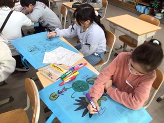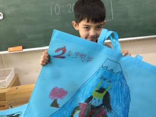 図工で制作した作品を、まとめて持ち帰るために使う作品ぶくろ。そこに2年生の思い出を描きます。好きなキャラクターを描いている人が多いです。中には戦国武将を選んで描いた子もいます。