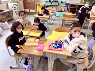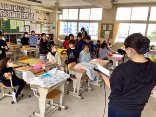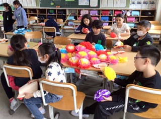 担任の先生の話を真剣に聞いて、準備を進めています。会場飾りを担当する3年生。華やかな体育館になりそうです。