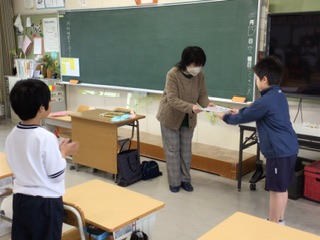 今日は今年度最後の読み語りでした。楽しく話を聞いたあと、お礼のメッセージカードをまとめたものをボランティアの方に贈りました。控え室で、みなさん嬉しそうに読んでみえました。