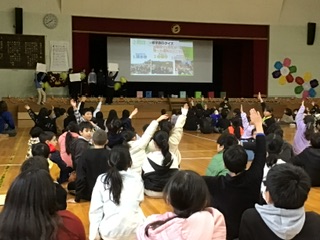 まずは、紹介メッセージ付きで6年生が一人ひとり入場しました。そのあと、6年生に関するクイズやインタビューで盛り上がりました。