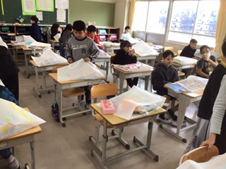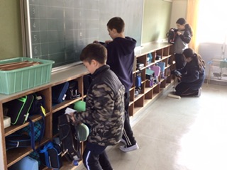 3、4年生。図工作品のまとめや棚の整頓をしています。