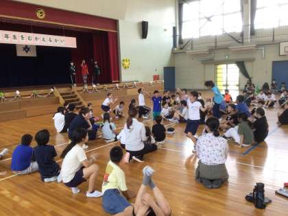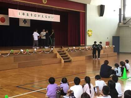 1年生を迎える会がありました。1年生の入場から始まり、ふれあい班で「フラフープ送り」を楽しみました。6年生が中心となって楽しい雰囲気をつくってくれて、とても盛り上がりました。