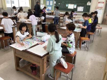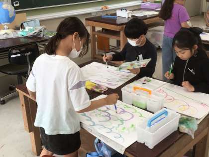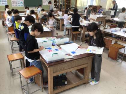 3年生の図工の時間の様子です。水の量を考えながら、4色の絵の具をそのまま使ったり、色を混ぜたりして、「いい感じ」に絵を描くことに挑戦しました。みんな、思い思いに筆を走らせ、個性あふれる「いい感じ」を表現していました。