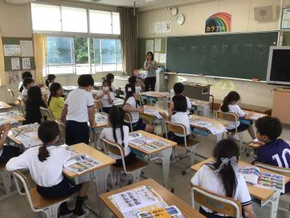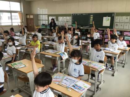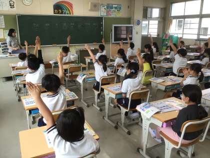 3年生の社会の授業の様子です。地図記号の勉強をしました。みんな、手の挙げ方がとても素敵でした。がんばって地図記号を覚えてね。