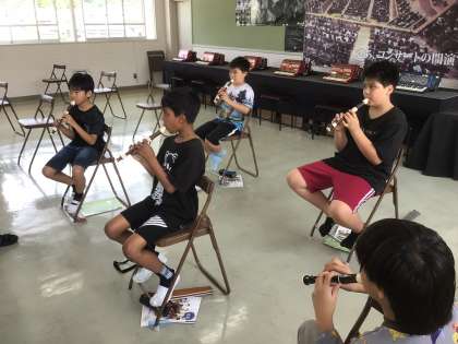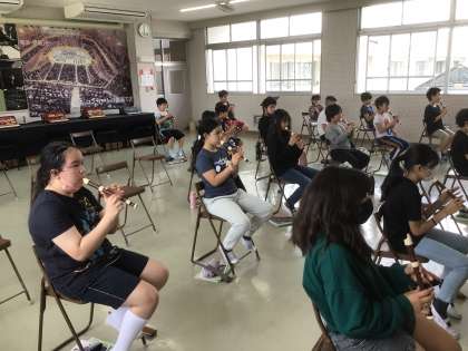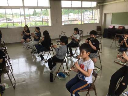 5年生の音楽の授業の様子です。「小さな約束」という曲の前半部分をリコーダーで演奏する練習をしました。最後まで上手に吹けるように頑張ってね。