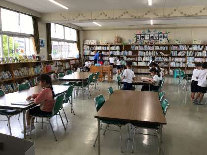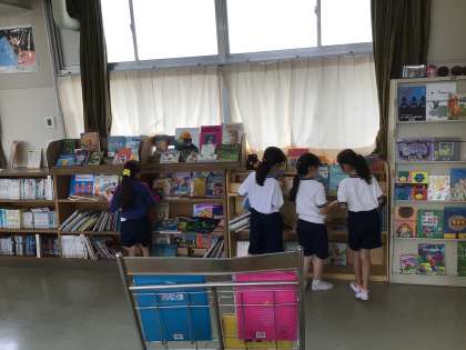 図書館に行って本を借りました。実は、4月の図書館調べによると、2年生の一人当たりの本の貸し出し冊数が、全校で1番でした。たくさん本を借りています。しかし、いつも同じような本を読んでいる子もいます。いろいろな種類の本に触れられるよう声をかけていきます。
