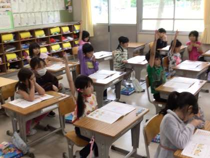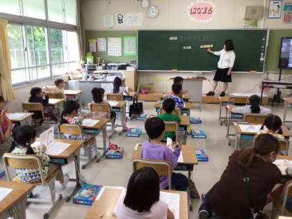 1年生の算数の授業の様子です。「8の数を知ろう」という内容で学習しました。おはじきを使うなどして、8の数を2つの数字に分ける勉強をしました。