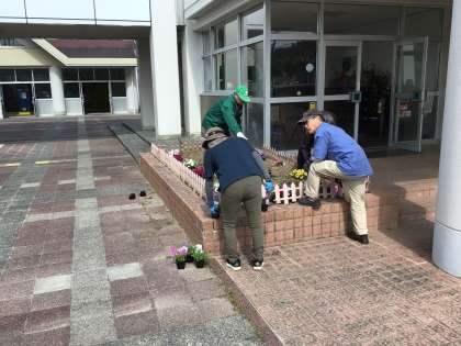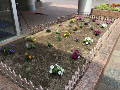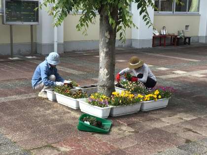 花ボランティアさんの活動があり、玄関横の花壇とプランターの花を一部植え替えてくれました。草取りもしてくださり、とてもきれいになりました。いつも花壇等をきれいにしてくれる花ボランティアのみなさん、ありがとうございます。