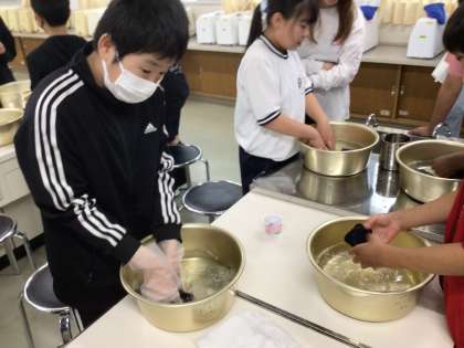 6年生の家庭科の様子です。「洗濯マスターになろう」という学習課題のもと、靴下を手洗いしました。汚れを落とそうと一生懸命もみ洗いをすることができました。