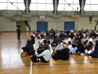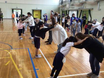 中京大学の中野教授、豊田市役所の方、ボランティアの方にお越しいただき、保健集会を開催しました。「親子で遊んで、運動の楽しさを知ろう」という内容で、2・3年生と保護者の方が参加しました。
