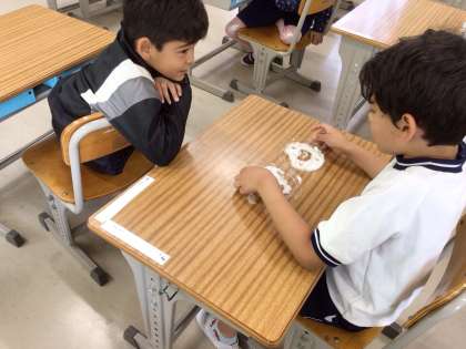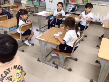 国語の授業で「さとうとしお」の学習をしています。実際に砂糖と塩を触って違いを学びました。