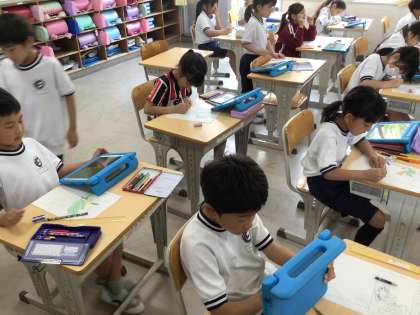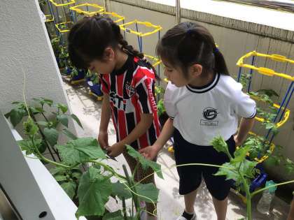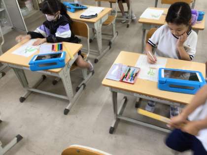 2年生の生活科の授業の様子です。育てている野菜の観察をしました。葉っぱの感触、枚数等、細かなところまでよく観察して記録を書くことができました。