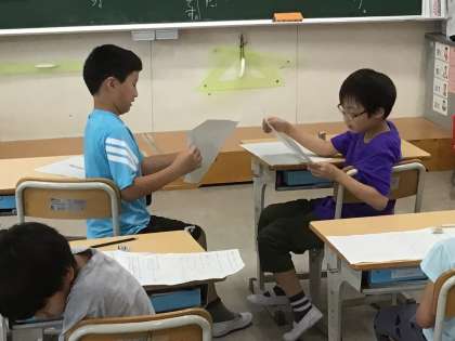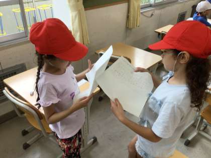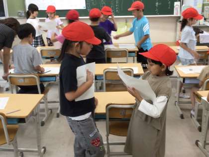 2年生の国語の授業の様子です。わかりやすく文章を書く練習をしました。書いた文章を読み合い、互いのよいところを伝え合いました。