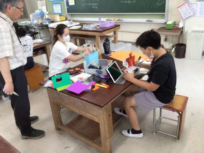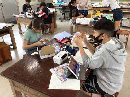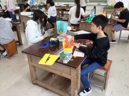 6年生の図工の授業の様子です。動くおもちゃの完成が近づいてきています。みんな、作品づくりに一生懸命取り組んでいます。