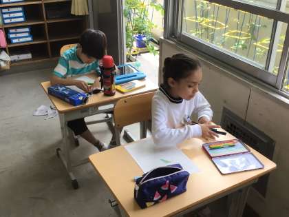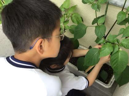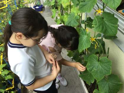 2年生の生活科の授業の様子です。育てている野菜につき始めた実の観察をしました。実の数を数えたり、ものさしで実の大きさを測ったりと、一人一人が詳しく観察したことを一生懸命記録しました。