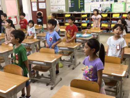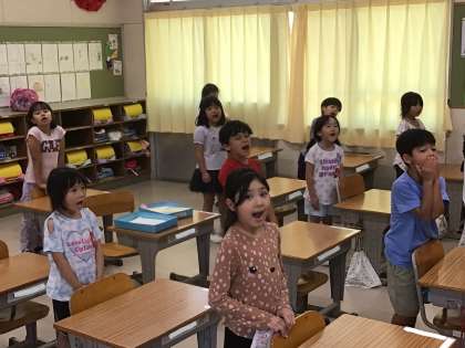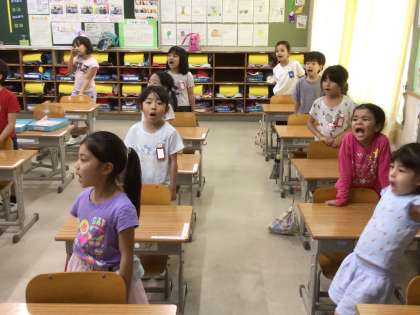 1年生が音楽で校歌を歌っている様子です。元気に大きな声で自信をもって歌えるようになってきています。