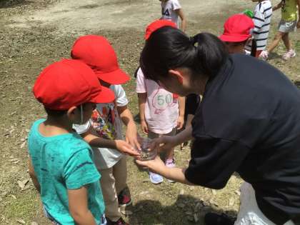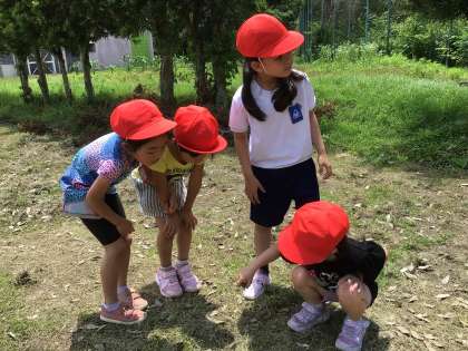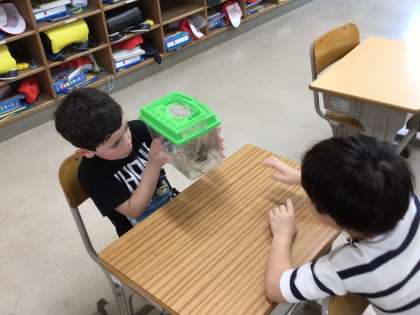 1年生が生活科の授業で虫探しをしました。バッタを見つけ、教室で一人ずつ観察しました。