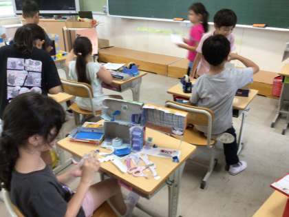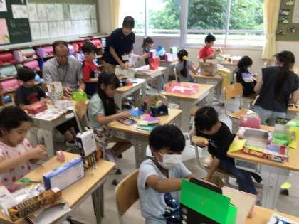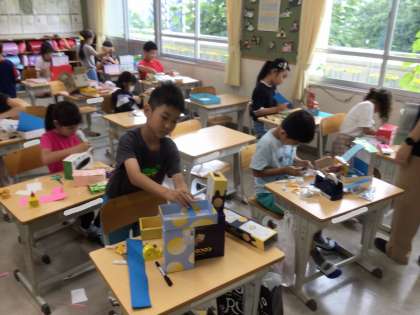 2年生の図工の授業の様子です。「かわいい小さなお友だちのおうちをつくろう」という課題のもと、一人一人が工夫をこらした家を作っています。