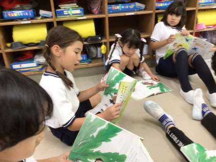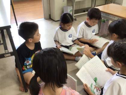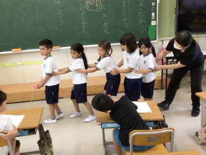 1年生の国語の授業の様子です。「おおきなかぶ」のお話を学習しています。みんなで読む練習をしたり、役を決めて劇の練習をしたりしました。