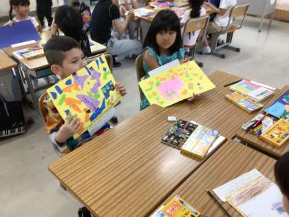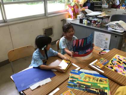 1年生の図工の授業の様子です。先週、完成した作品の題名や気に入っているところをグループで伝え合いました。