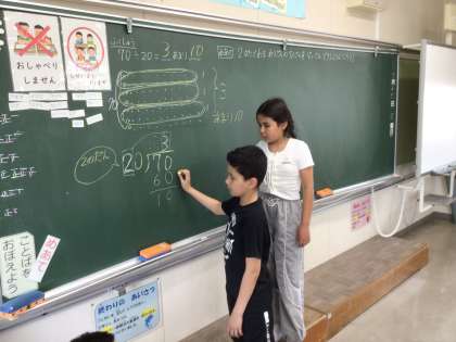 4年生の算数の授業の様子です。「2けたで割るわり算の筆算」の学習をしています。みんな、一生懸命に問題に取り組んでいます。