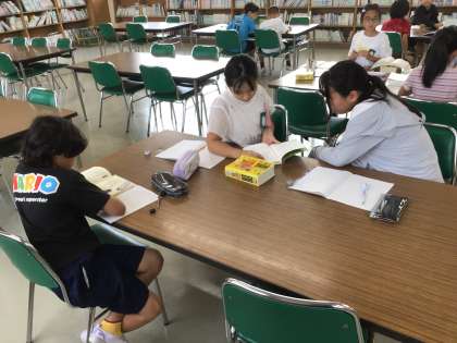 4年生の国語の授業の様子です。気になる故事成語やことわざを紹介カードに書くための下調べを図書室で行いました。