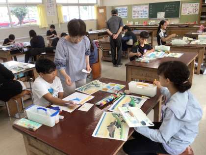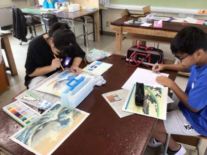 6年生の図工の授業の様子です。「君も葛飾北斎になろう」をテーマに、葛飾北斎の3枚の版画から1枚を選んで絵を描いています。細かな描写まで意識して取り組みました。