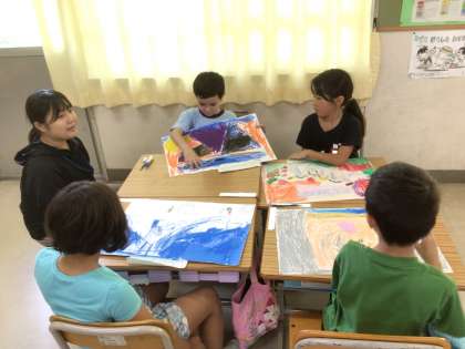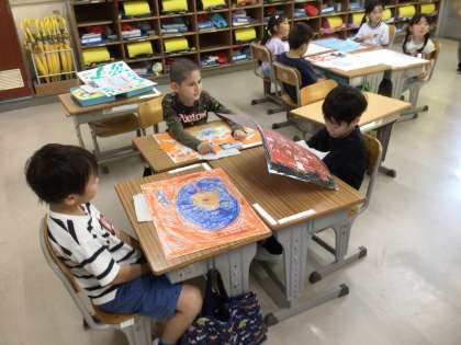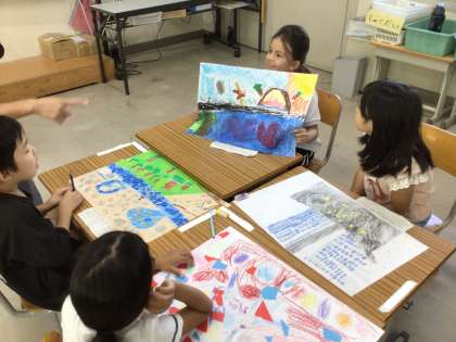 1年生の図工の授業の様子です。クレヨンや折り紙を使って描いた夏休みの思い出の絵の発表会をしました。グループごとに、何をしているところを描いたのかなどについて話しました。