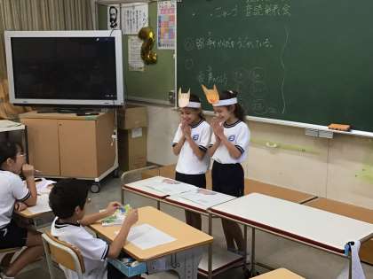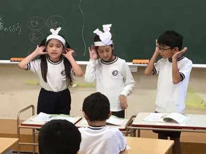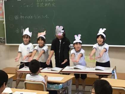 2年生の国語の様子です。「ニャーゴ」の音読発表会を行いました。動作を入れたり、表現を工夫したりするなど、登場するネコやネズミになりきって音読することができました。