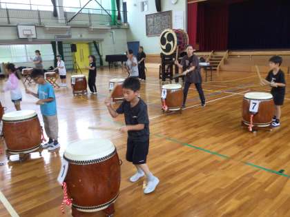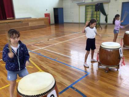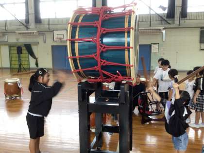 2年生の和太鼓体験の様子です。2年生も4・5・6組と一緒に体験を楽しみました。