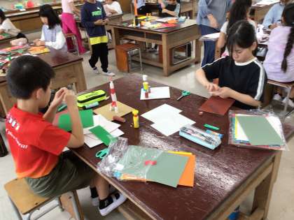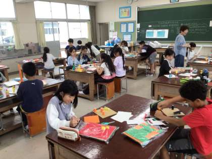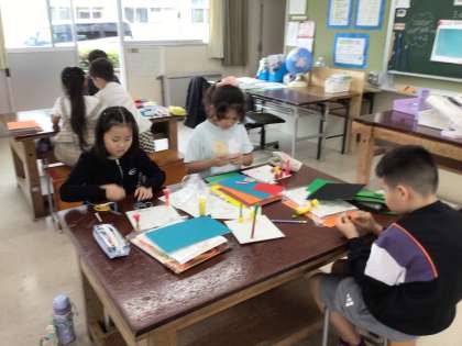 3年生の図工の様子です。色のついた段ボールを切り抜いたり、重ねたりして「楽しいもの」を作成中です。