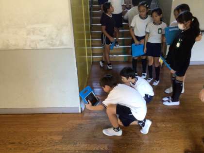 4年2組の理科の様子です。水蒸気をつかまえる実験を行っています。教室、ベランダ、廊下でつかまえられる水蒸気の量に違いがあるのか、1階と3階では違いがあるのかについて実験しています。