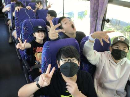 バスレクを楽しみながら過ごしています。最初の休憩を終え、奈良に向けて進んでいます。みんな、元気に過ごしています。