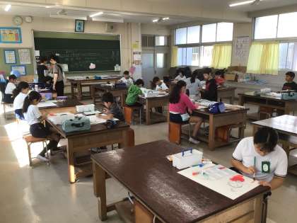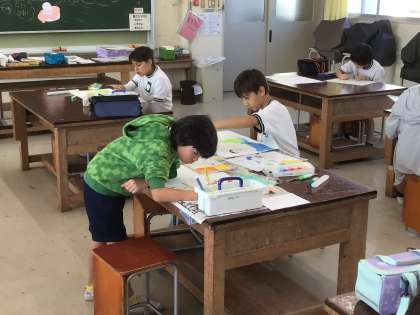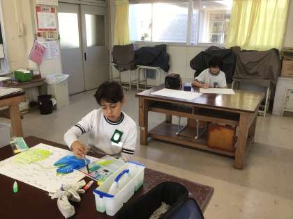 4年2組の図工の様子です。『島ひきおに』の読書感想画を描いています。島ひきおにの気持ちを表現しようと、塗り方を工夫しながら取り組んでいます。