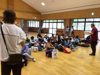 5年生は無事に野外センターに到着しました。入所式では、みんなで元気に所員の方々にあいさつできました。