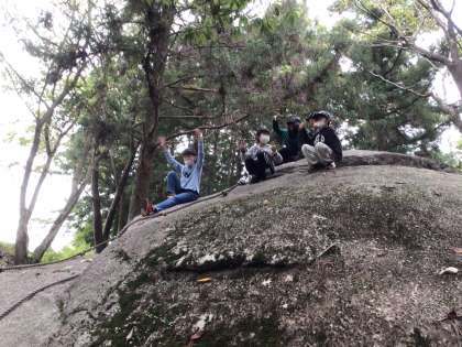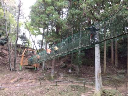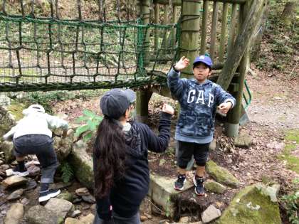アスレチックの前に、サワガニ探しをしました。今は、みんな元気にアスレチックを楽しんでいます。